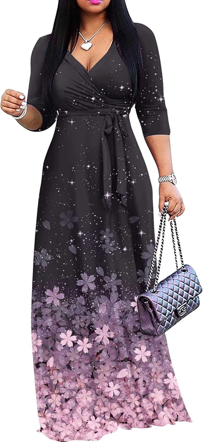 Plus Size Maxi Dress for Women Casual Summer Sundress V-Neck 3/4 Sleeve