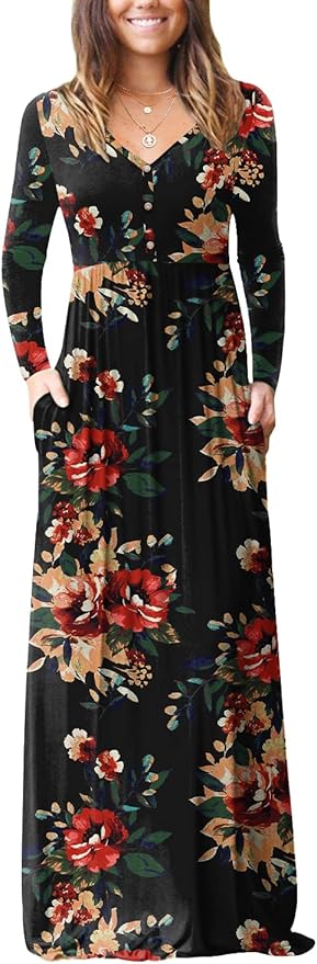 Womens Maxi Dress 2024 Long Sleeve V Neck Casual Button Boho Tshirt Long Dress with Pockets
