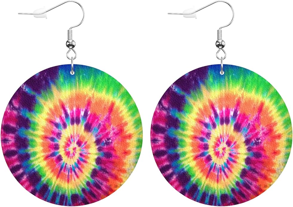 Rainbow Colors Round Faux Leather Earrings for Women Bright Abstract Color Red Green Yellow Orange Stripe Lightweight