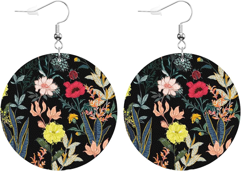 Sunflowers Round Faux Leather Earrings for Women Watercolor Floral Bouquet Buds Leaf Herbal Lightweight Double-Side Printed Drop